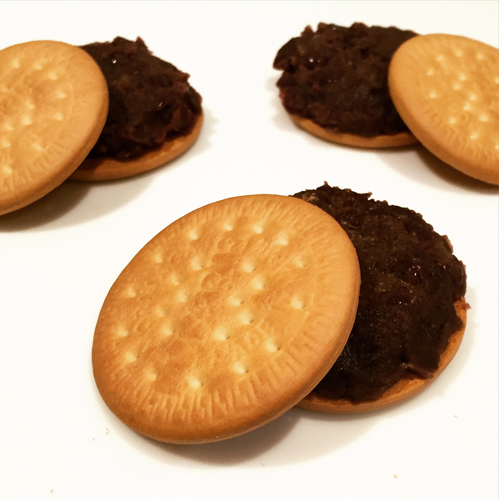 圧力鍋で作った粒あんをマリービスケットにサンドしました