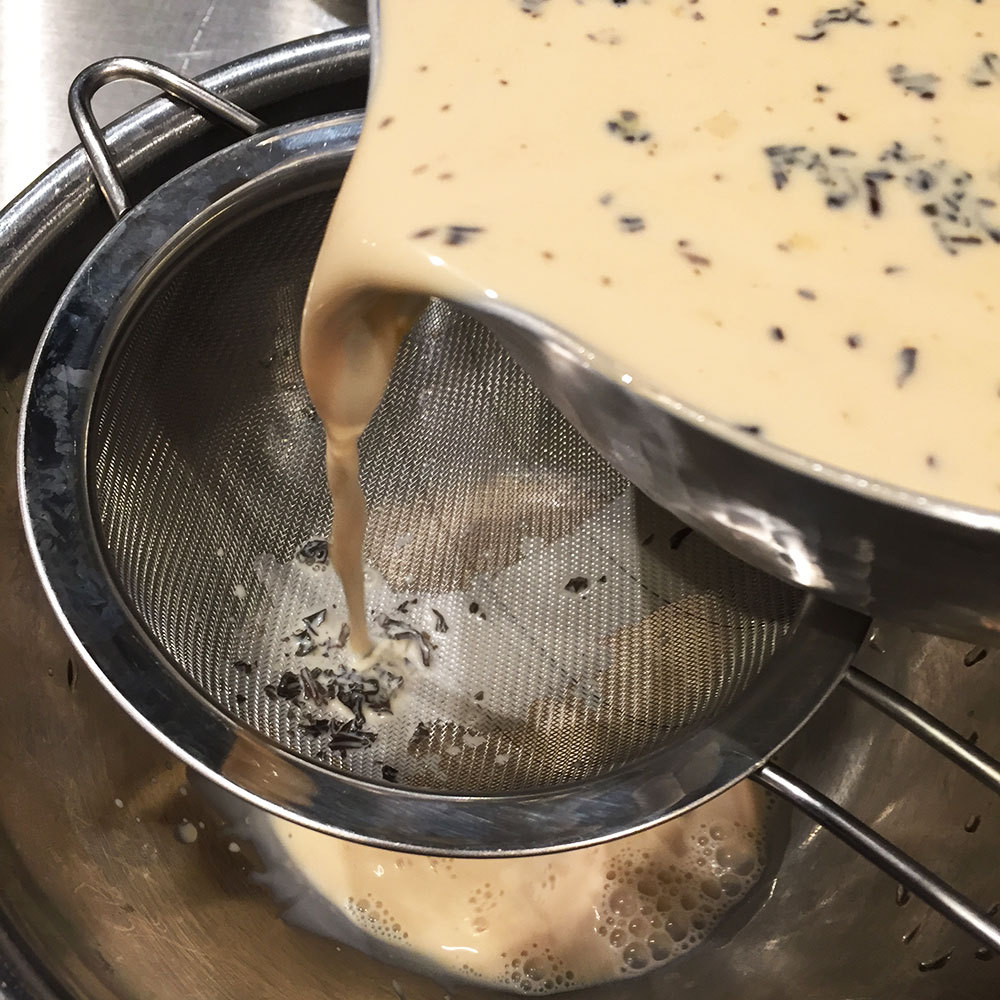 - (計りの上に鍋を置き、全部グラムで計量しました)鍋に牛乳、生クリーム、砂糖を入れ沸騰直前まで温めます